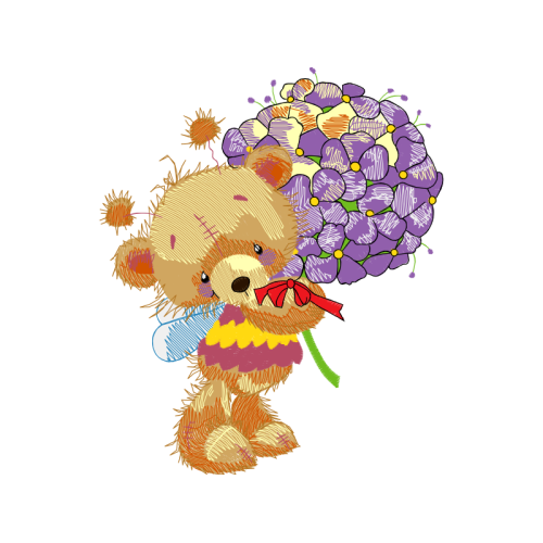 A beautiful cartoon image. This wedding and love artwork features teddy bear, toy, cut flowers.