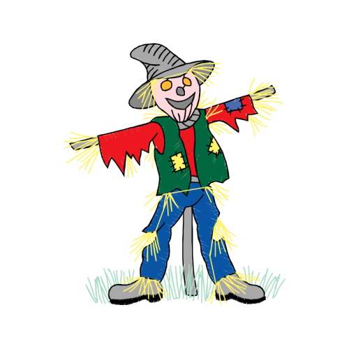 A beautiful cartoon image. This people and kids artwork features scarecrow, hat, child art.